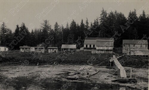 Scope & Content: Item consists of a view of buildings at Crippen's Boneless Herring Factory. Handwritten annotation on recto reads: "Grippen's [sic] Boneless Herring Factory. Digby Island. 1909." Stamped annotation on verso reads: "Wrathall's Photo Finishing Cameras and Supplies Prince Rupert, B. C. JR Wrathall."