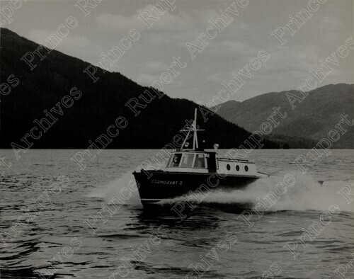 Scope & Content: Item consists of a view of the boat "Cormorant II" in a harbour (the Prince Rupert harbour?). Handwritten annotation on recto reads: "1960 - Cororant [sic] II. Made Fast Trips to Stewart." Stamped annotation on verso of copy 2 reads: "Photo by Jack Wrathall Prince Rupert, B. C."