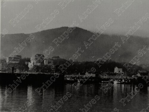 Scope & Content: Item consists of a view of the waterfront from the Prince Rupert harbour. The view includes houses, Imperial Oil tanks and a dock. Handwritten annotation on recto of copy 2 reads: "Water Front. Pr. Rupert. 1917." Stamped annotation on verso of copy 2 reads: "Photo by Jack Wrathall Prince Rupert, B. C."