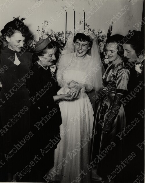 Scope & Content: Item consists of Charlotte Rowse (nee Balagno) with four other women at her wedding to Denis Rowse. Pictured from left to right is: an unidentified woman, Mary Astoria, Charlotte Rowse, Nora McCaffery and Pauline Astoria. Handwritten annotation on recto reads: "1. 2. Mary Astoria 3. Charlotte 4. Nora McCaffery. 5. Pauline Astoria. Mr. & Mrs. Dennis Rouse [sic] Wedding. Nov. 4. 1950." Stamped annotation on verso reads: "Photo by Jack Wrathall Prince Rupert, B. C."