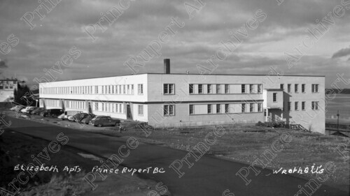 Scope & Content: Item consists of Elizabeth Apartments on 1st Avenue West and 7th Street with cars parked outside and a slight view of harbour in the background. Handwritten annotation on recto of copy 1 reads: "Elizabeth Apts Prince Rupert BC. Wrathall's." Stamped annotation on verso of copy 2 reads: "Photo by Jack Wrathall Prince Rupert, B. C. 1941." Handwritten annotation on recto of copy 3 reads: "Built by U. S. Army. 1943. Elizebeth [sic] Apts. 700 Blk. 1st. Ave. W. 1947."