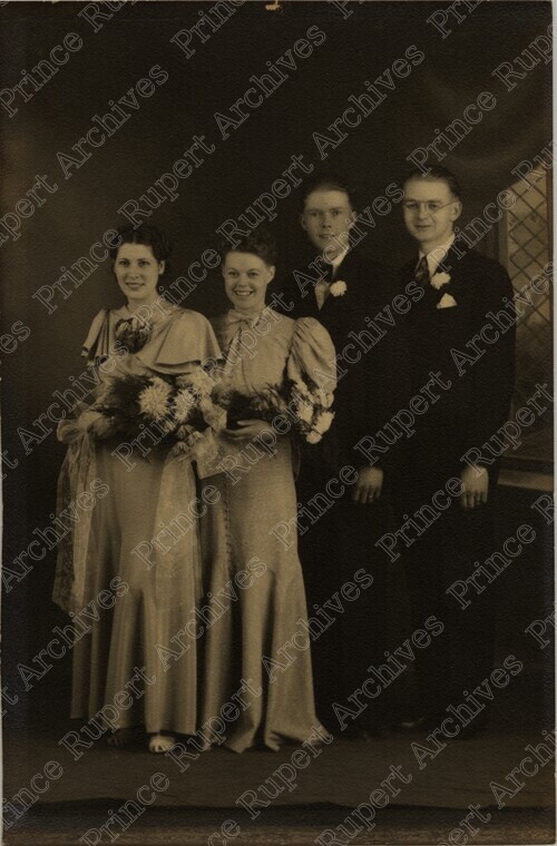 Scope & Content: Item consists of two women and two men standing together. Pictured from left to right is: Lorna Wrathall, Doris Larson, Herb Larson and Jack Wrathall. Handwritten annotation on verso reads: "Mr. & Mrs. Doris & Herb Larson. 1 - Lorna Wrathall - 4 Jack Wrathall. 1930's."