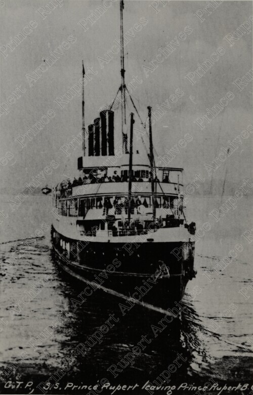 Scope & Content: Item consists of the GTP ship SS "Prince Rupert" leaving the Prince Rupert harbour. Handwritten annotation on recto reads: "G.T.P., S.S. Prince Rupert leaving Prince Rupert B.C. 1910." Stamped annotation on verso reads: "Photo by Jack Wrathall Prince Rupert, B. C."
