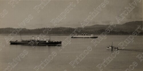 Scope & Content: Item consists of the SS "Prince Rupert," another steamship and a boat in a body of water (the Prince Rupert harbour?). Handwritten annotation on recto of copy 2 reads: "S.S. Prince Rupert." Stamped annotation on verso of copies 1 and 2 reads: "Photo by Jack Wrathall Prince Rupert, B. C."
