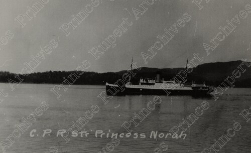 Scope & Content: Item consists of the CP steamship SS "Princess Norah" in the Prince Rupert harbour. Handwritten annotation on recto reads: "C. P. R [sic] Str Princess Norah. Pr. Rupert, B.C. 1934." Stamped annotation on verso reads: "Photo by Jack Wrathall Prince Rupert, B. C."