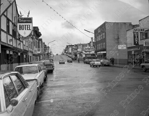Scope & Content: Item consists of a view of the 600 and 700 blocks of 3rd Avenue West including the Empress Hotel, Skeena Taxi, Carol Lee's Millinery, Royal Hotel, Pagoda Restaurant, Universal Ladies' & Men's Wear, Grand Shoe Repairs, and the Commodore Cafe. Handwritten annotation on recto of copy 2 reads: "3rd. Ave. From 7th. St. 1960." Handwritten annotation on recto of copy 3 reads: "6-700 Blks. 3rd. Ave. W. Prince Rupert, B. C. 1960." Stamped annotation on verso of copies 2 and 3 reads: "Photo by Jack Wrathall Prince Rupert, B. C."