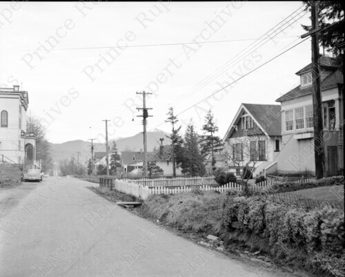 Scope & Content: Item consists of a view of homes, and a convent on the 400 block of 4th Avenue West from Agnew Place. Handwritten annotation on recto of copy 2 reads: "4th. Ave. From Agnew Place. 1960." Stamped annotation on verso of copy 2 reads: "Photo by Jack Wrathall Prince Rupert, B. C."
