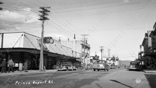 Scope & Content: Item consists of a view of 3rd Avenue West from 5th Street including Watts & Nickerson, the Bank of Montreal, city hall Besner Block, cars and pedestrians. A wooden carving of an Indigenous man with a headdress can be seen beside the sidewalk. Handwritten annotation on recto of copies 1 and 2 reads: "Prince Rupert B.C. W." Handwritten annotation on recto of copy 2 reads: "3rd. Ave. From 5th. St. 1951. J.R.W." Stamped annotation on verso of copy 2 reads: "Photo by Jack Wrathall Prince Rupert, B. C."