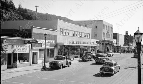 Scope & Content: Item consists of 3rd Avenue West including F.W. Woolworth Co., Overwaitea Foods, the Killas and Christopher Block, Wallace's Department Store, the Capitol Theatre, pedestrians, cars, and the lawn of the federal building. Handwritten annotation on recto of copy 2 reads: "400-500 Blks. 3rd. Ave. 1951." Stamped annotation on verso of copy 2 reads: "Photo by Jack Wrathall Prince Rupert, B. C."