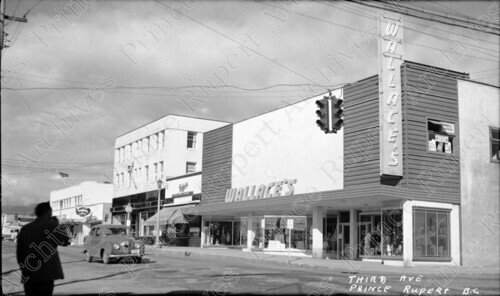 Scope & Content: Item consists of 3rd Avenue West from 4th Street including Wallace's Department Store, Bulger's Jewellers, the Killas & Christopher Block and Overwaitea Foods. Handwritten annotation on recto reads: "Third Ave Prince Rupert B.C."