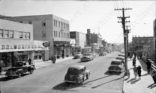 Scope & Content: Item consists of 3rd Avenue West including F.W. Woolworth Co., Overwaitea Foods, the Killas and Christopher Block, Bulger's Jewellers and Wallace's Department Store.