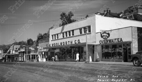 Scope & Content: Item consists of a view of 3rd Avenue West including Overwaitea Foods, F.W. Woolworth Co., Northland Dairy, and pedestrians. Houses can be seen in the background. Handwritten annotation on recto reads: "Third Ave Prince Rupert B.C."