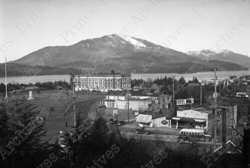 Scope & Content: Item consists of a view of 3rd Avenue East McBride Street showing Gordon's Hardware, the office of T. McMeekin, and the contracting firm Mitchell & Currie. The Prince Rupert Courthouse on Market Place can also be seen. Mount Morse can be seen in the background. Handwritten annotation on recto of copy 2 reads: "3rd. Ave. & McBride St. Market Place. 1949." Stamped annotation on verso of copies 2 and 3 reads: "Photo by Jack Wrathall Prince Rupert, B. C."