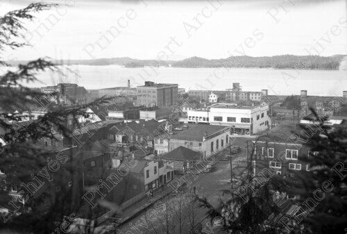 Scope & Content: Item consists of a view of 5th Street and 3rd Avenue West from 4th Avenue West including buildings, homes, cars, the Prince Rupert Hotel, the Central Hotel and the US Army Administration Buildings. Handwritten annotation on recto of copy 2 reads: "5th. St. & 3rd. Ave. Rupert Hotel. American Warehouse. Pr. Rupert. 1945." Stamped annotation on verso of copy 2 reads: "Photo by Jack Wrathall Prince Rupert, B. C."
