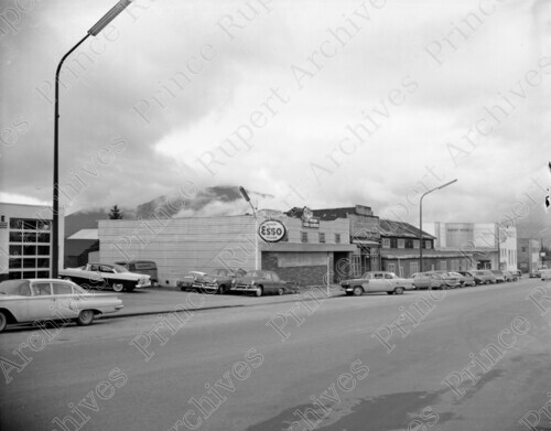 Scope & Content: Item consists of a view of 2nd Avenue West and 2nd Street including an Esso gas station, Rupert Motors, Regal Printers and vehicles parked along the streets. Handwritten annotation on recto of copy 2 reads: "2nd. Ave. From 2nd. St. 1962." Stamped annotation on verso of copy 2 reads: "Photo by Jack Wrathall Prince Rupert, B. C."