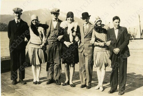 Scope & Content: Item consists of a group of seven people standing on the CN Wharf. Mount Morse can be seen in the background. Pictured from left to right is: Bob Ross, Cleo Mussallem, Jack Wrathall, Buela McKinley, Ernie Alliston, Evelyn Anderson and Buster Hill. Handwritten annotation on verso reads: "1. Bob Ross. 2. Cleo Mussallem. 3. Jack Wrathall. 4. Buela McKinley. 5. Ernie Alliston. 6. Evelyn Anderson. 7. Buster Hill. C.N. Wharf 1928."
