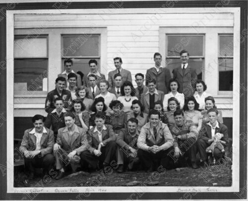 Scope & Content: Item consists of Prince Rupert and Ocean Falls male and females basketball teams gathered outside a school building. Pictured in the second row farthest on the left is Vern Ciccone. Pictured in the third row farthest on the left is Nick "Boyd" Gurvich. Pictured in the back row farthest on the left is Peter Postuk. Handwritten annotation on recto of copy 2 reads: "Prince Rupert - Ocean Falls - Basket Ball Teams. 1944."