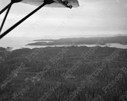 Scope & Content: Item consists of an aerial view of Digby Island and Metlakatla with a glimpse of a seaplane wing in the corner of the photograph.