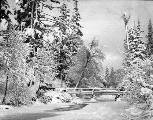 Scope & Content: Item consists of Hays Creek in McClymont Park during the winter. A bridge can be seen running over the Creek. Handwritten annotation on recto of copies 4 reads: "Winter - McClymont Park. Hays Creek Pr. Rupert. 1935." Stamped annotation on verso of copies 3 and 4 reads: "Photo by Jack Wrathall Prince Rupert, B. C."