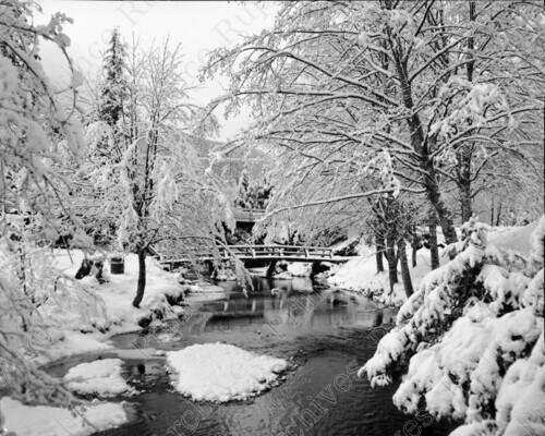 Scope & Content: Item consists of Hays Creek and with two bridges running over it in McClymont Park during the winter.