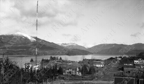 Scope & Content: Item consists of the 100 to 200 Blocks of 1st Avenue West including the Royal Canadian Legion, CN House, Naval Drill Hall, Bayview Apartments, harbour and Prince Rupert Drydock and Shipyard. Handwritten annotation on recto of copy 2 reads: "100 - 200 Blks - 1st. Ave. W. Looking. East. Legion CN.R. House. Naval Drill Hall. Bay View Apts. 1950." Stamped annotation on verso of copy 2 reads: "Photo by Jack Wrathall Prince Rupert, B. C."