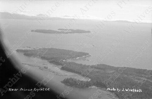 Scope & Content: Item consists of an aerial view of Digby Island and the Kinahan Islands. Handwritten annotation on verso reads: "Near Prince Rupert BC. Photo by J. Wrathall."