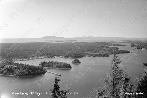 Scope & Content: Item consists of a view from Mount Hays of Dodge Cove on Digby Island, Metlakatla and Dodge Island. Handwritten annotation on recto of copies 1 and 2 reads: "View from Mt Hays Prince Rupert BC Photo by J.W." Handwritten annotation on recto of copy 2 reads: "Dodge Cove. Wireless Station. Digby Isl. Tugwell Isl. 1961." Stamped annotation on verso of copy 2 reads: "Photo by Jack Wrathall Prince Rupert, B. C."