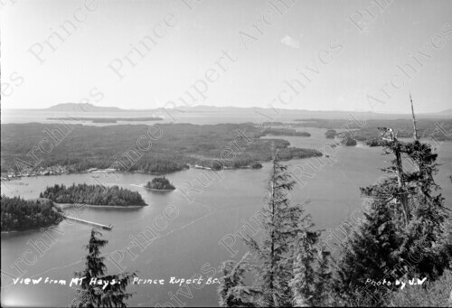 Scope & Content: Item consists of a view from Mount Hays of Dodge Cove on Digby Island, Dodge Island and Metlakatla. Handwritten annotation on recto reads: "View from Mt Hays. Prince Rupert BC. Photo by J.W."