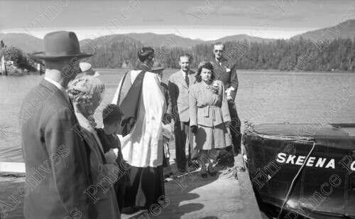 Scope & Content: Item consists of Joyce Wilson, a pastor, Mayor Harry M. Daggett and others at the christening of Queen Charlotte Airline Ltd.'s "Skeena Queen" seaplane at Seal Cove.