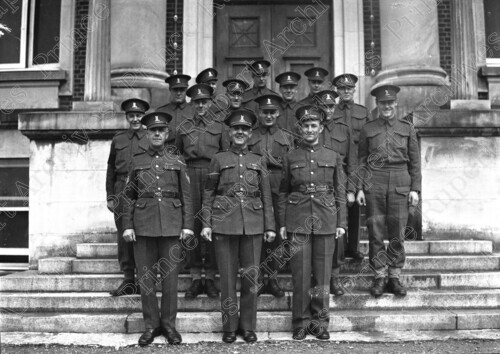 Scope & Content: Item consists of fifteen men from the Canadian Army 102nd Battalion Reserves in uniform standing on the front steps of the Prince Rupert Courthouse on Market Place.