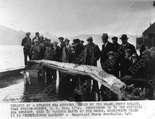 Title: Remains of a Strange Sea Monster Found on the Beach, Henry Island, Near Prince Rupert, B.C. November 1934