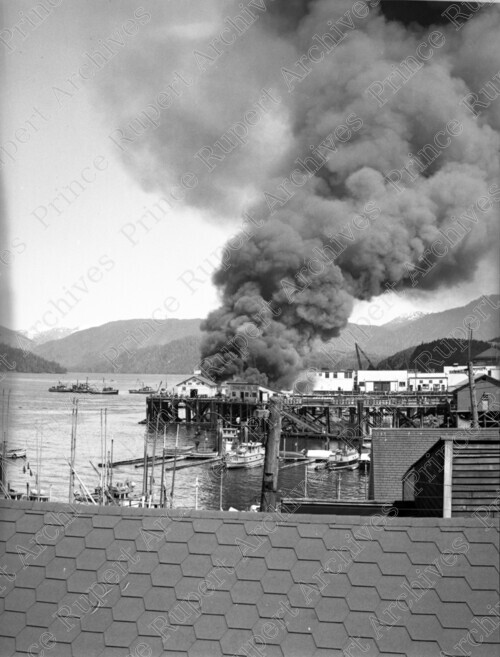 Title: Boat on Fire at Home Oil Co. at Prince Rupert, B.C. on May 23, 1947