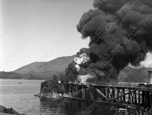 Title: Boat on Fire at Home Oil Co. in Prince Rupert, B.C. on May 23, 1947