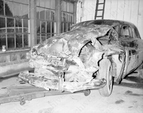 Title: Wrecked Car at McMeekin Thomas & Sons Hit by a Train on Highway at Prince Rupert, B.C. in 1953