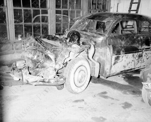 Title: Wrecked Car at McMeekin, Thomas & Sons Hit by a Train on the Highway at Prince Rupert, B.C. 1953