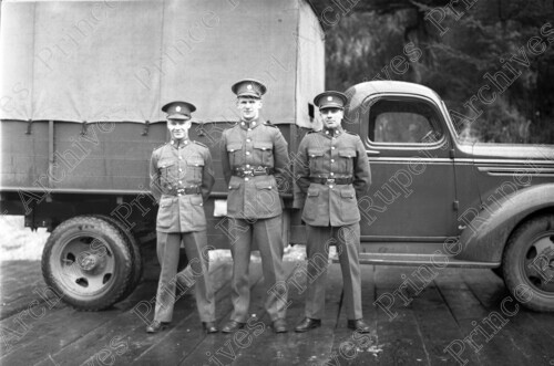 Scope & Content: Item consists of three Royal Canadian Army Services Corps members in uniform standing in front of an army truck on the 300 block of 1st Avenue East. The truck is in front of the Malkins Building which is not pictured.