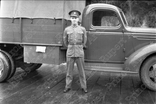 Title: An Army Service Corps Member in Uniform standing Near an Army Truck in Prince Rupert, B.C. in 1941