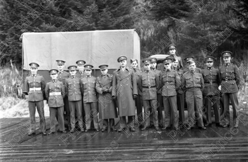 Scope & Content: Item consists of eighteen members of the Royal Canadian Army Service Corps in uniform standing in front of an army truck on the 300 block of 1st Avenue East. The truck is parked in front of the Malkins building which is not pictured. Stamped annotation on verso of copy 2 reads: "Photo by Jack Wrathall Prince Rupert, B. C. 1940."
