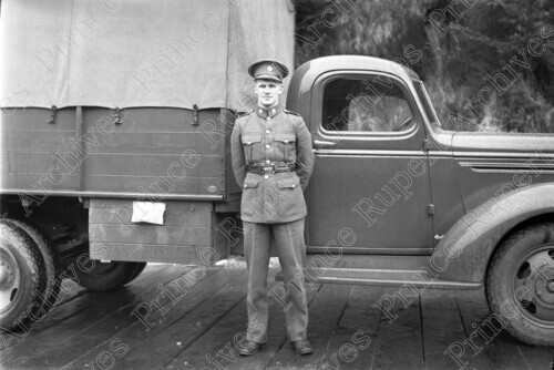 Title: Army Service Corps Member in Uniform Standing Near an Army Truck at Prince Rupert, B.C. in 1940