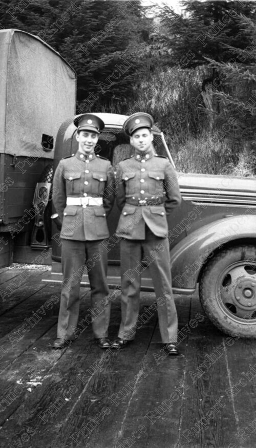 Title: Two Members of the Army Service Corps Squatting Near an Army Truck in Prince Rupert, B.C. in 1940