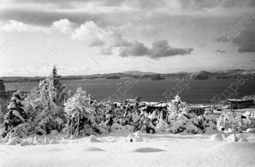 Title: View from Snowy Roosevelt Park of Downtown Prince Rupert in 1948