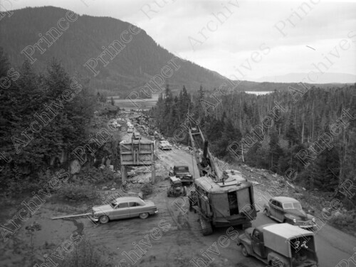 Title: Rebuilding Highway 16 near Galloway Rapids on Kaien Island, B.C. 1950