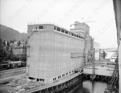 Scope & Content: Item consists of a view of the construction of new wing for the Canadian Government Grain Elevator. Railway cars on CN Railway tracks behind can be seen behind the elevator and houses can be seen above it. Handwritten annotation on recto of copy 2 reads: "Building New Wing to Pr. Rupert Elevator Near Completion. 1968." Stamped annotation on verso of copy 2 reads: "Photo by Jack Wrathall Prince Rupert, B. C." Typed annotation on recto of copy 3 reads: "Canadian Government Elevator Elevator Addition Prince Rupert, B.C. C.D. Howe Co. Ltd. Consulting Engineering. No. Date."