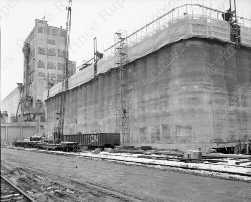 Scope & Content: Item consists of a view of the Canadian Government Grain Elevator during the building of a new wing. CN Railway tracks and railway cars can be seen in front of the grain elevator.