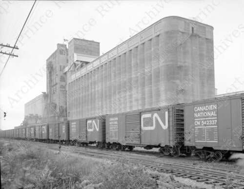 Scope & Content: Item consists of a view of the Canadian Government Grain Elevator's completed new wing. CN Railway cars and tracks can be seen in the foreground.