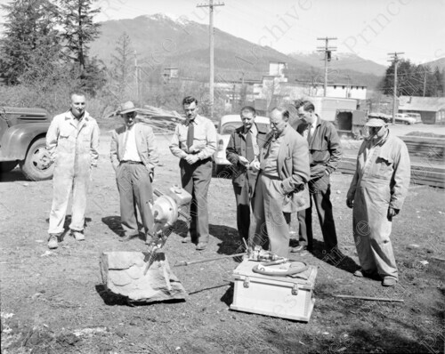 Title: City and Forestry Workers Looking at New Drill in Prince Rupert, B.C. in 1957