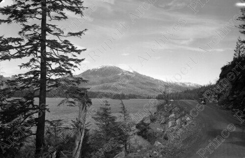 Scope & Content: Item consists of a view of a car on the highway to Port Edward The view includes surrounding mountains and water.
