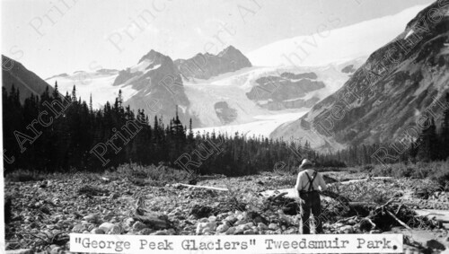 Scope & Content: Item consists of a back view of a man looking toward George Peak Glaciers and lakes in Tweedsmuir Provincial Park. Typed annotation on recto of copy 1 reads: ""George Peak Glaciers" Tweedsmuir Park." Handwritten annotation on recto of copy 2 reads: ""George Peak Glaciers" Near Burn [sic] Lake, B.C. 1930." Stamped annotation on verso of copy 2 reads: "Photo by Jack Wrathall Prince Rupert, B. C."