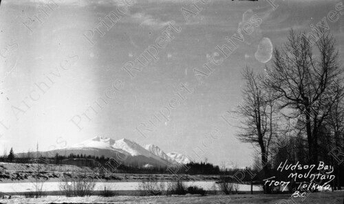 Scope & Content: Item consists of a view of the Hudson Bay Mountain Telkwa. The view also includes trees and a river. Handwritten annotation on recto reads: "Hudson Bay Mountain From Telkwa B.C."