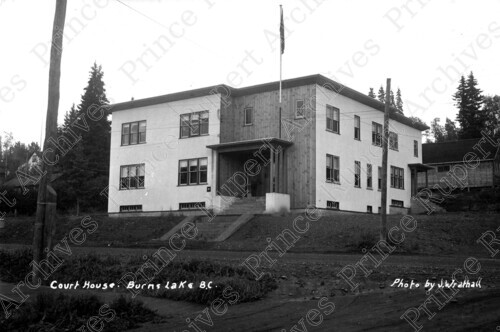 Scope & Content: Item consists of a view of the courthouse in Burns Lake taken from across the road. Handwritten annotation on recto of copies 1, 2 and 3 reads: "Courthouse, Burns Lake, B.C. Photo by J. Wrathall." Handwritten annotation on verso of copy 2 reads: "50 - Dot. 50 - Drug Store." Handwritten annotation on recto of copy 3 reads: "1948." Stamped annotation on verso of copy 3 reads: "Photo by Jack Wrathall Prince Rupert, B. C."
